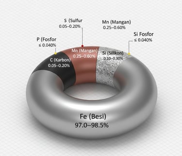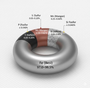 Komposisi dapat bervariasi tergantung pabrik, namun secara umum menggunakan baja karbon rendah. Kisaran komposisinya: