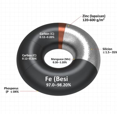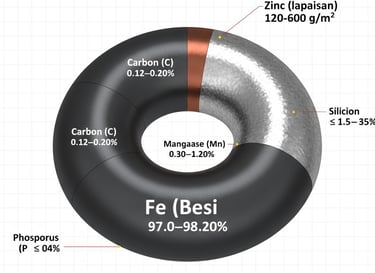 Zinc (lapisan) 120–600 g/m² tergantung kelas galvanis
